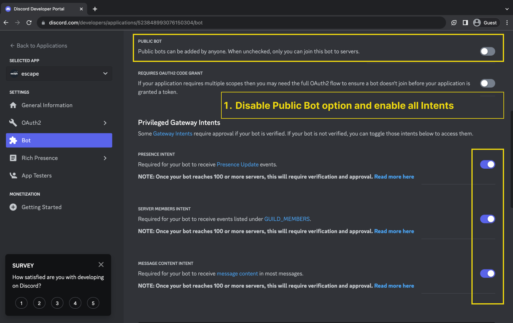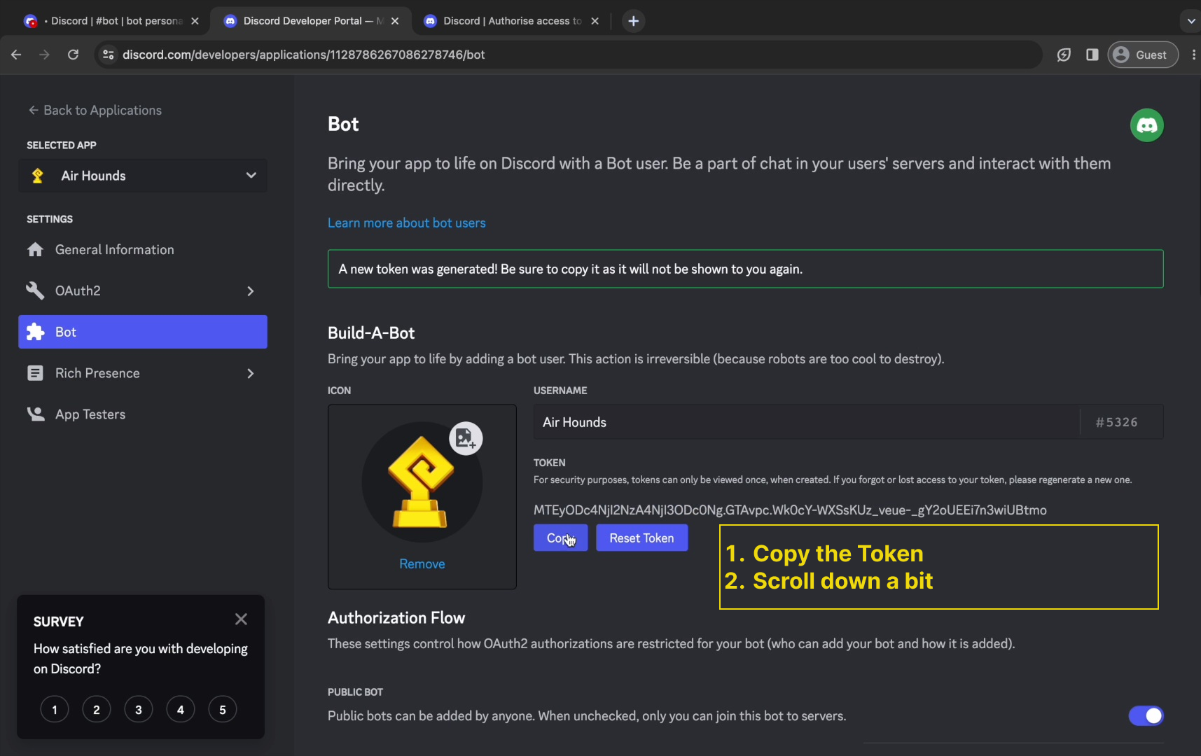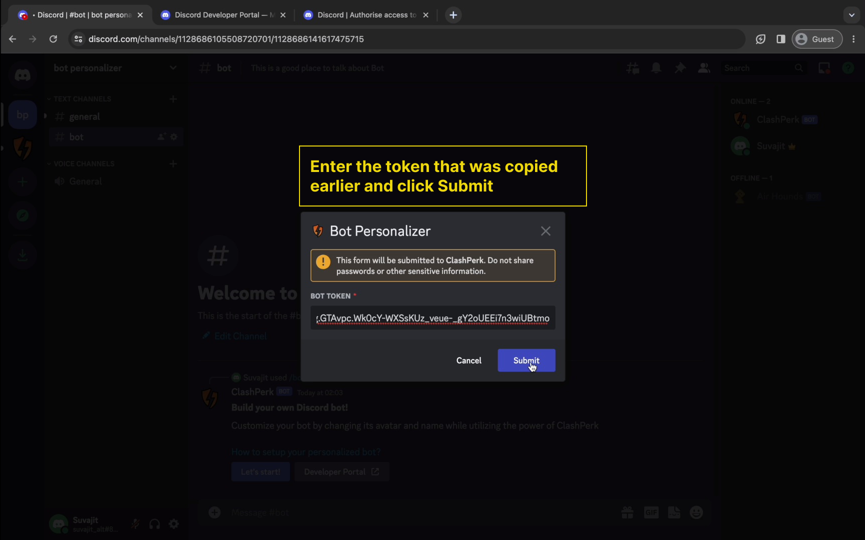 The custom bot requires a bot token that you need to retrieve from the Discord Developer Portal. This token is a highly sensitive credential and you must not share it with anyone.